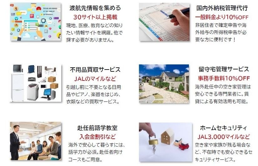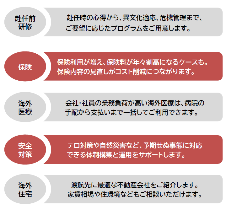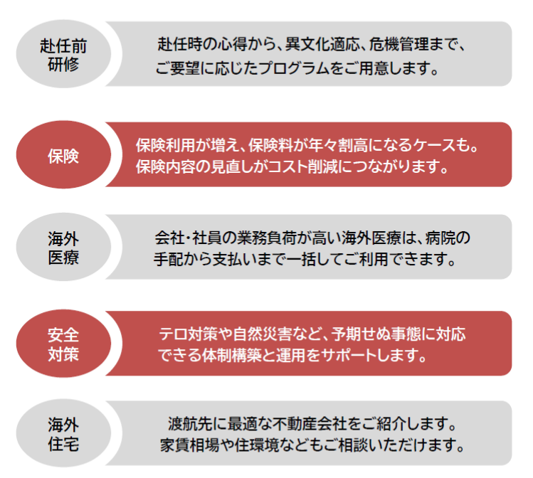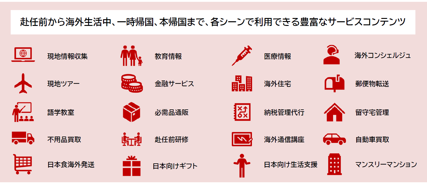 赴任前から海外生活中、一時帰国、本帰国まで、各シーンで利用できる豊富なサービスコンテンツ例
