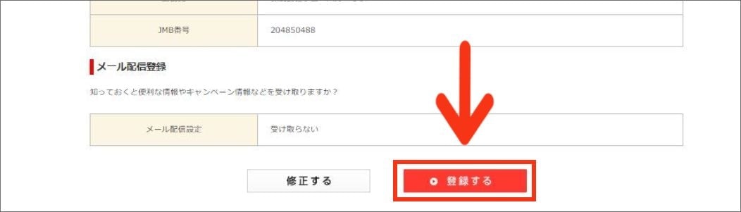 STEP5より「会員情報確認画面」に遷移します。下にスクロールし、「登録する」をクリック