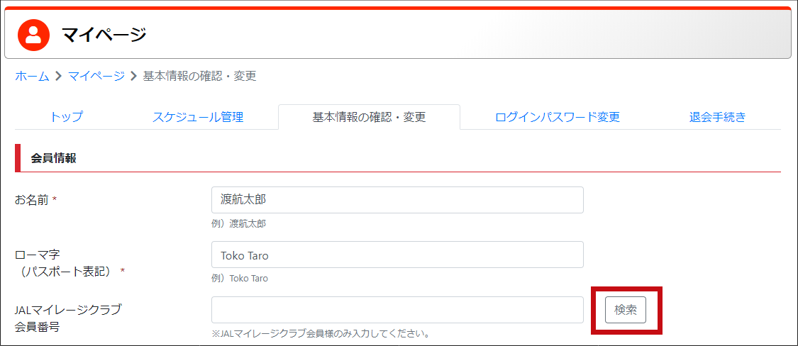 「マイぺ―ジ」→「会員情報」より「JMBお得意様番号」の確認ができます。