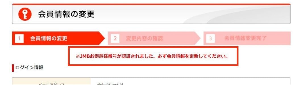 「お得様番号」が正常に認証されるとマイページの「会員情報変更」ページに「JMBお得意様番号が認証されました」と表示されます。