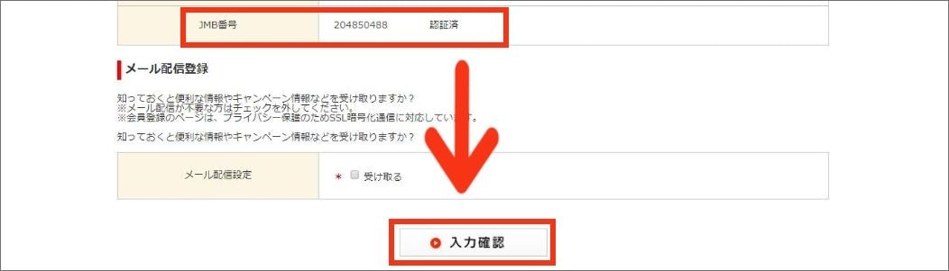 STEP4の会員情報変更画面で下にスクロールすると、「JMBお得様番号」が反映され、「認証済み」と表示されていることを確認し、「入力確認」をクリック