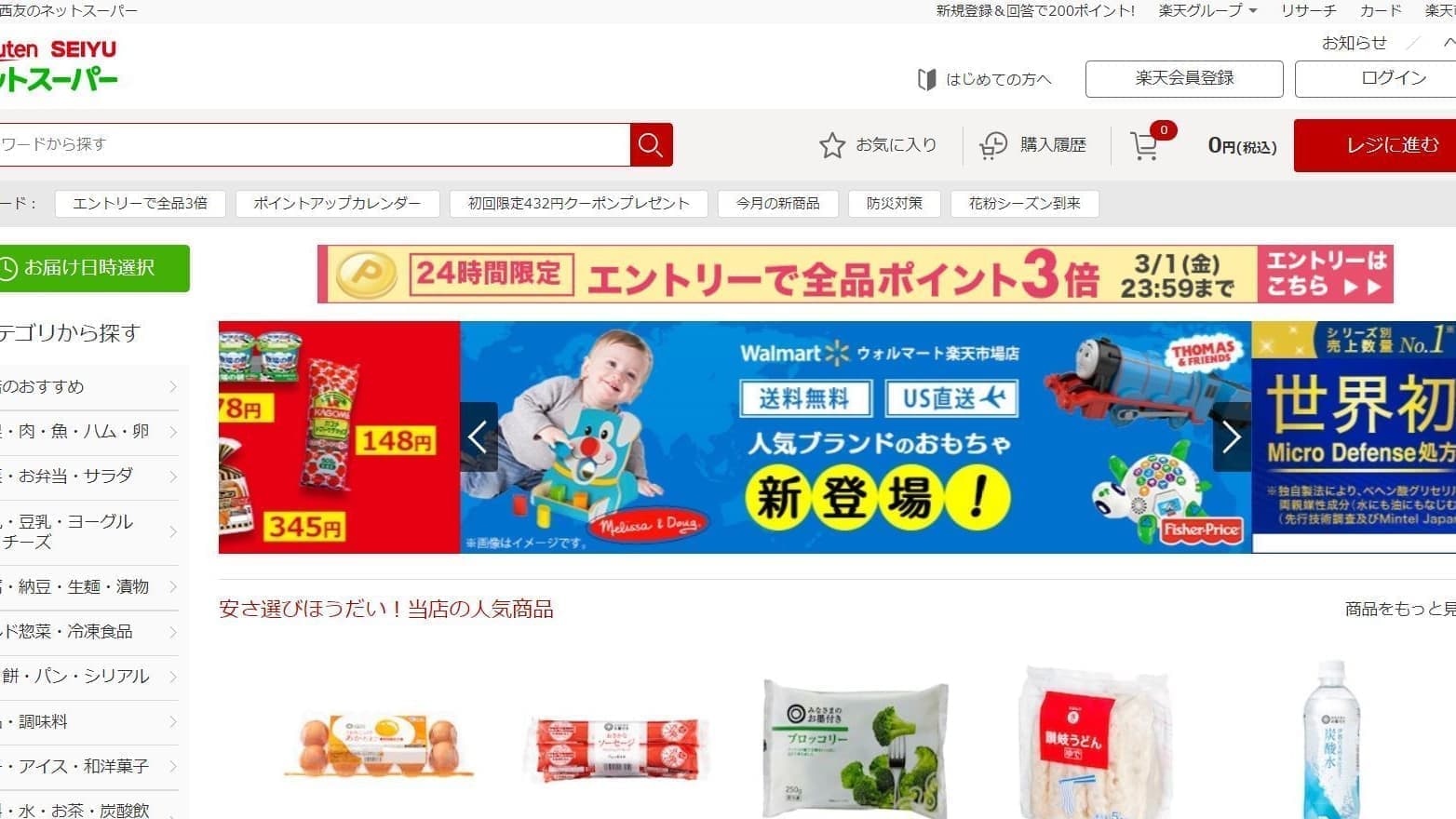 品揃えも食料品から日用品まで豊富に揃っています。楽天ポイントも貯まります。