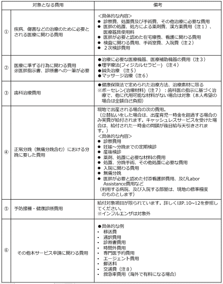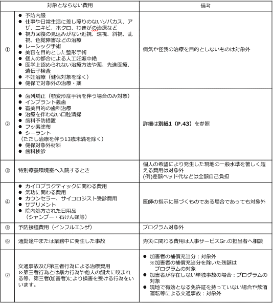 本プログラムの給付対象となる医療費は、健康保険の給付対象となる医療費及び会社が費用負担を認める医療費(健康診断、予防接種、妊娠出産)となります。