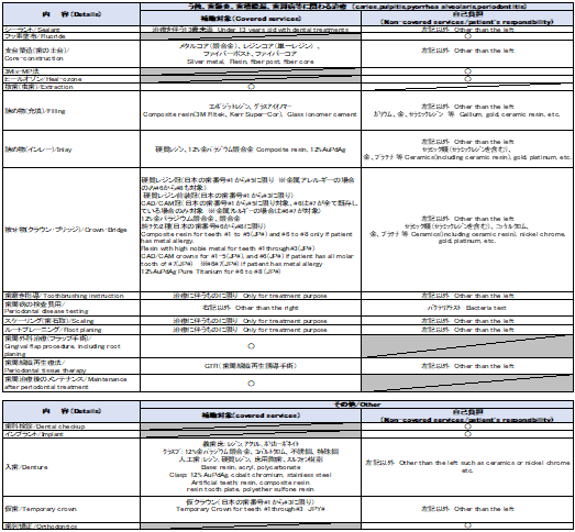 「歯科治療 健保対象一覧」はプランの概要を示したものです。ヘルスケアプログラムの補償対象範囲に該当するかどうかについて正確に決定(判断)するにはご相談いただく必要があります。