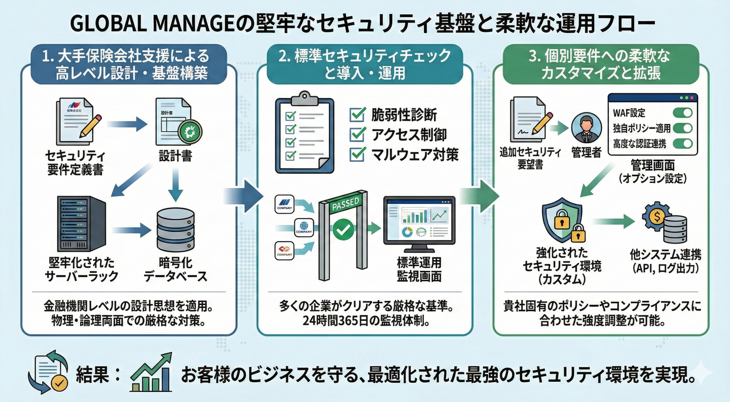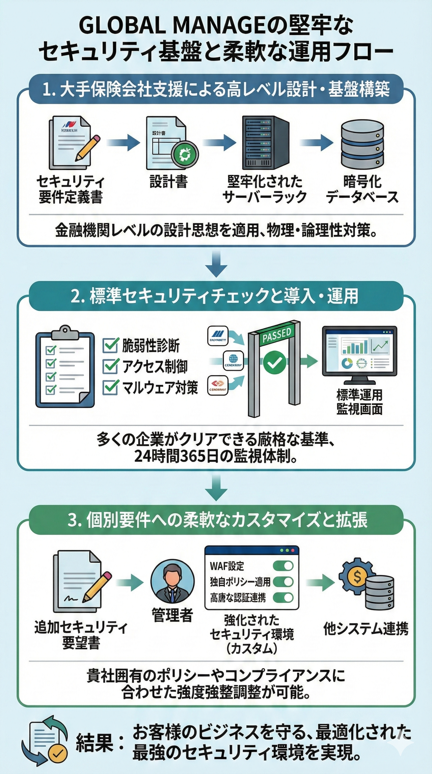 GLOBAL MANAGEでは大手保険会社の構築支援により、セキュリティレベルの高い設計、仕様となっています。