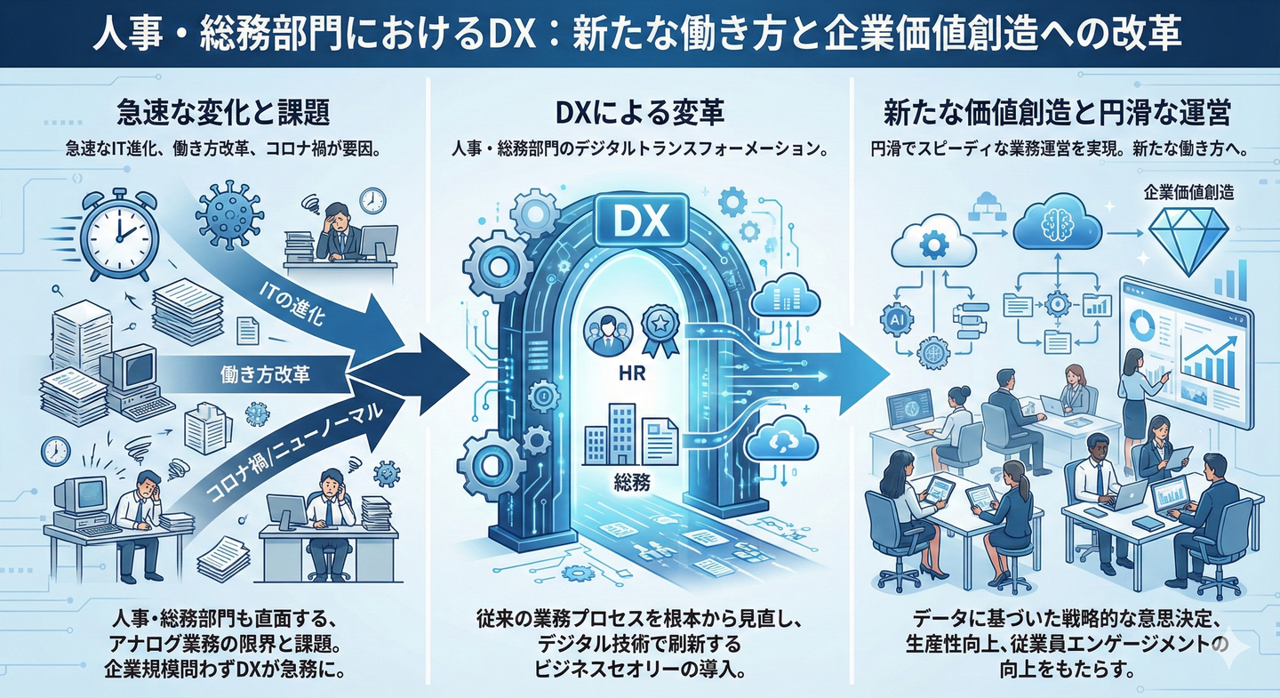 人事・総務部門においても、急速なITの進化をきっかけに「働き方改革」や「コロナ禍によるニューノーマル」などが要因となり、管理部門における円滑でスピーディな業務運営を生み出すためのビジネスセオリーが求められています。