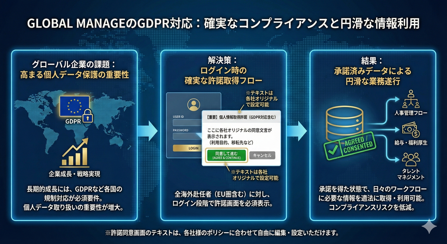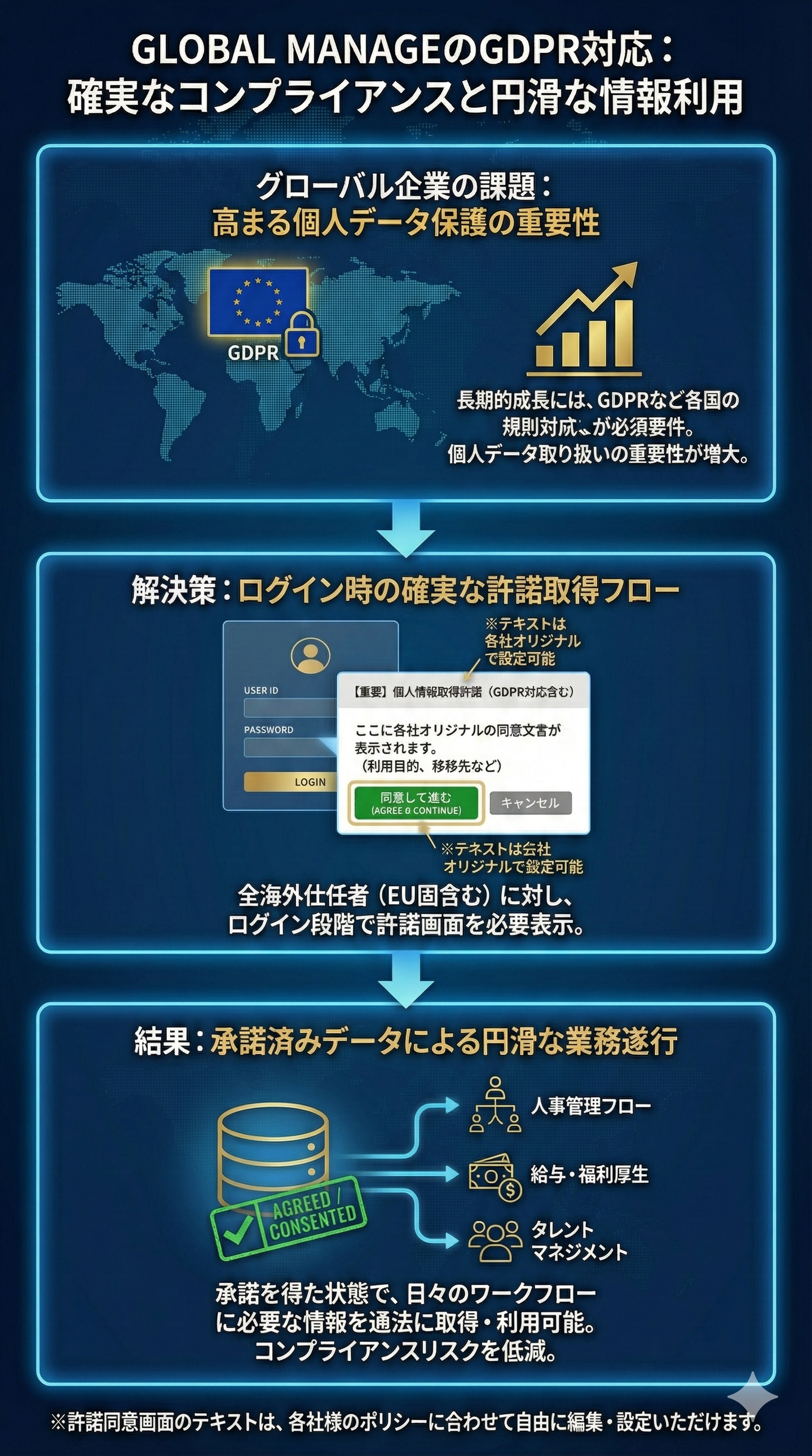 GLOBAL MANAGEでは、ログイン段階で全海外赴任者に対し、個人情報取得許諾画面の表示が必須となっているため、EU圏対象の社員かた承諾を得た状態で日々のワークフローにおいて必要な情報の取得・利用が可能です。