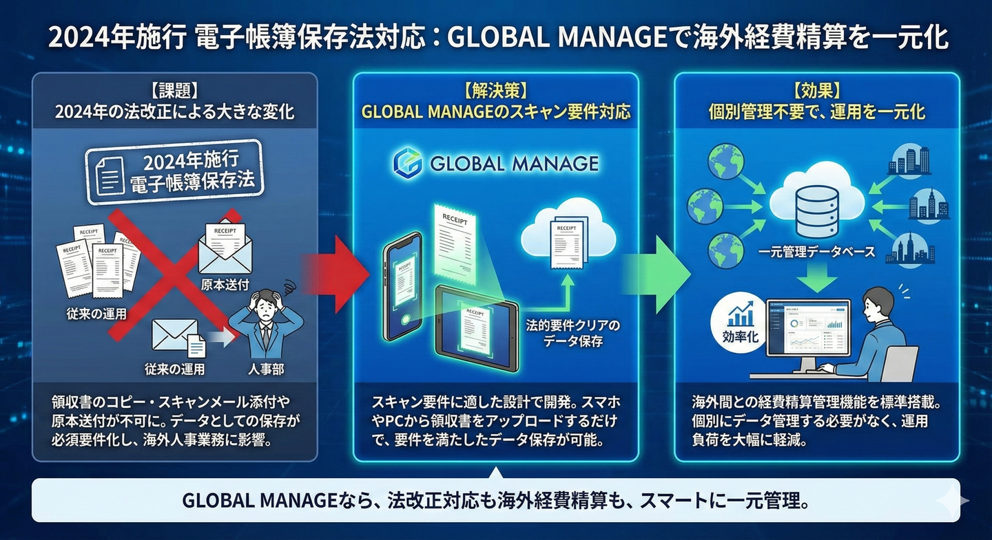 2024年より施行された電子帳簿保存法は、経費精算業務において、海外人事業務に大きな影響を及ぼしています。