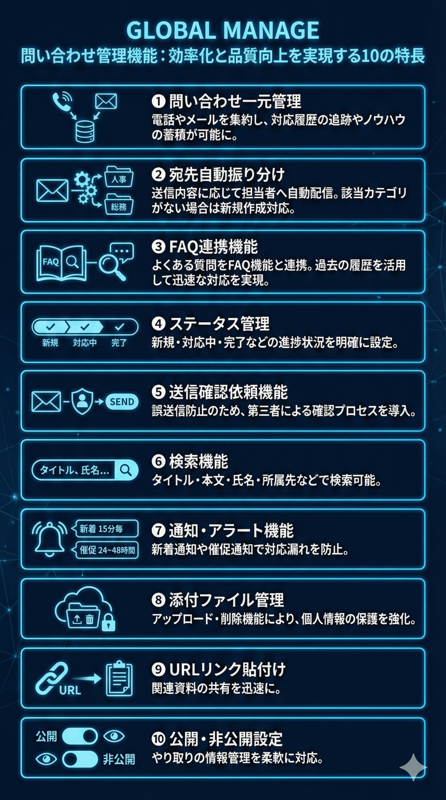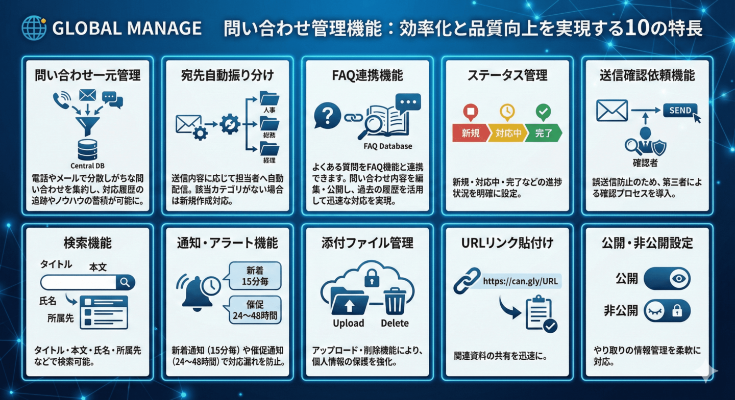 従来のチャット機能を拡張した「問い合わせ管理機能」では、赴任者からの問い合わせ対応を効率化し、AIを活用したFAQ機能との連携により迅速な回答が可能となります。