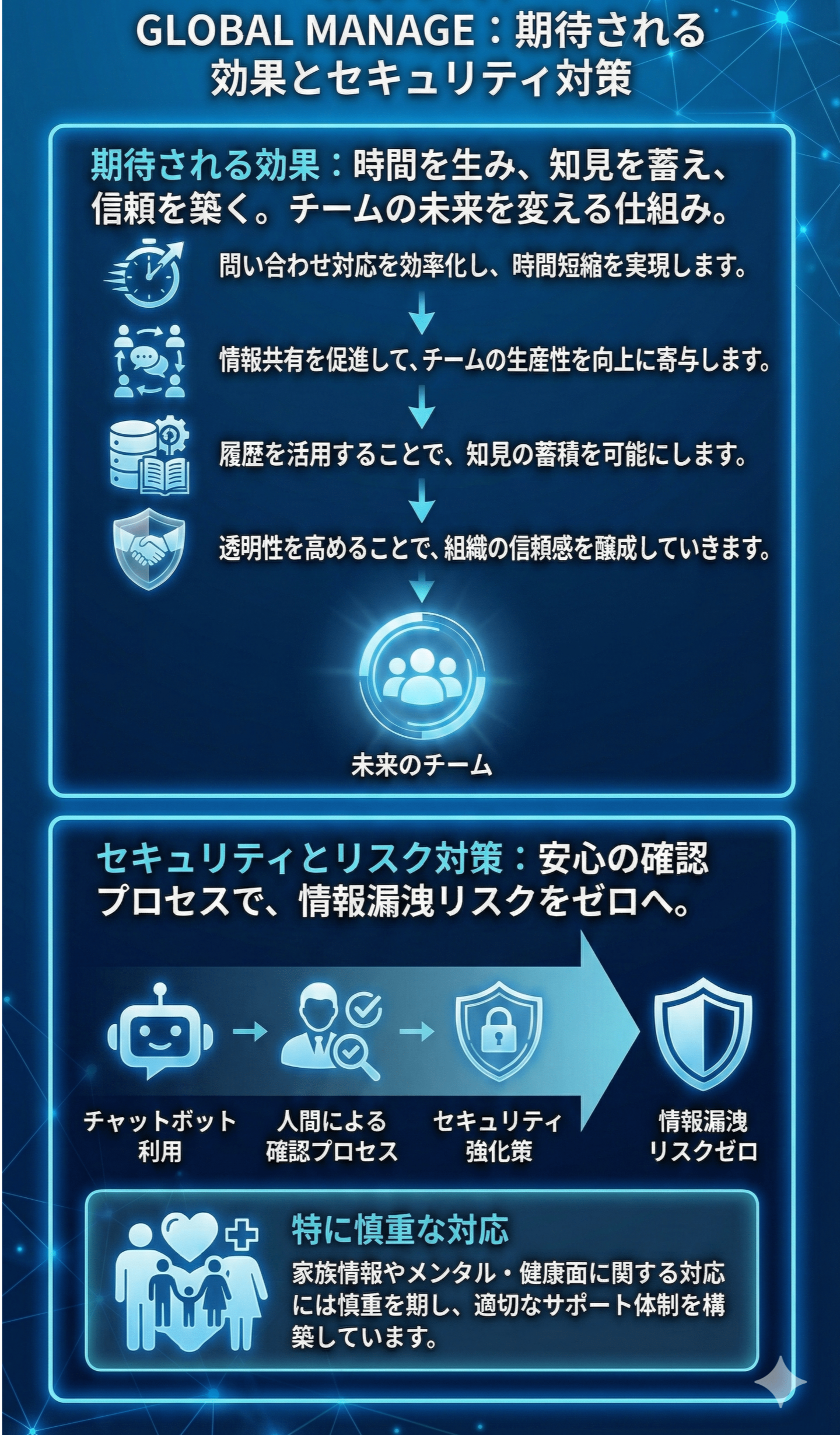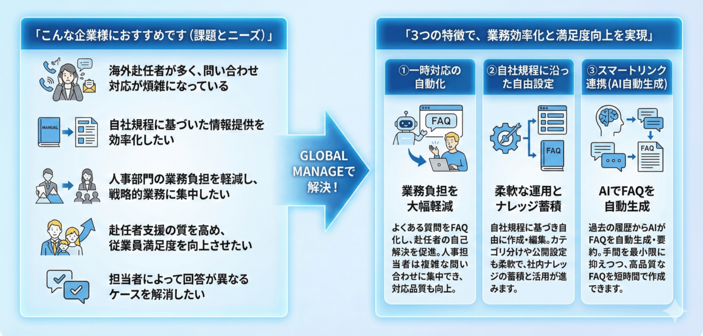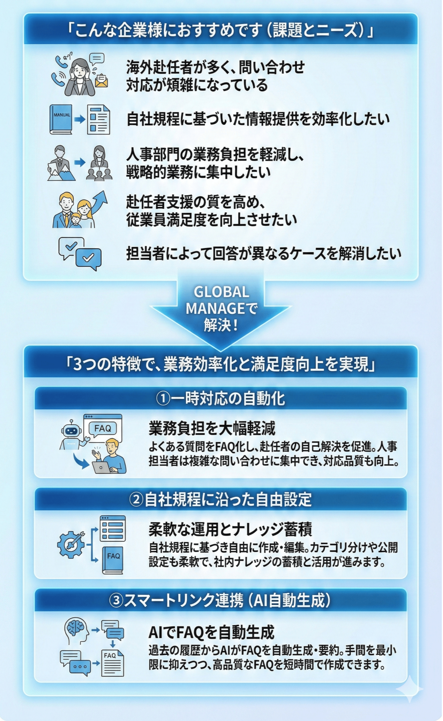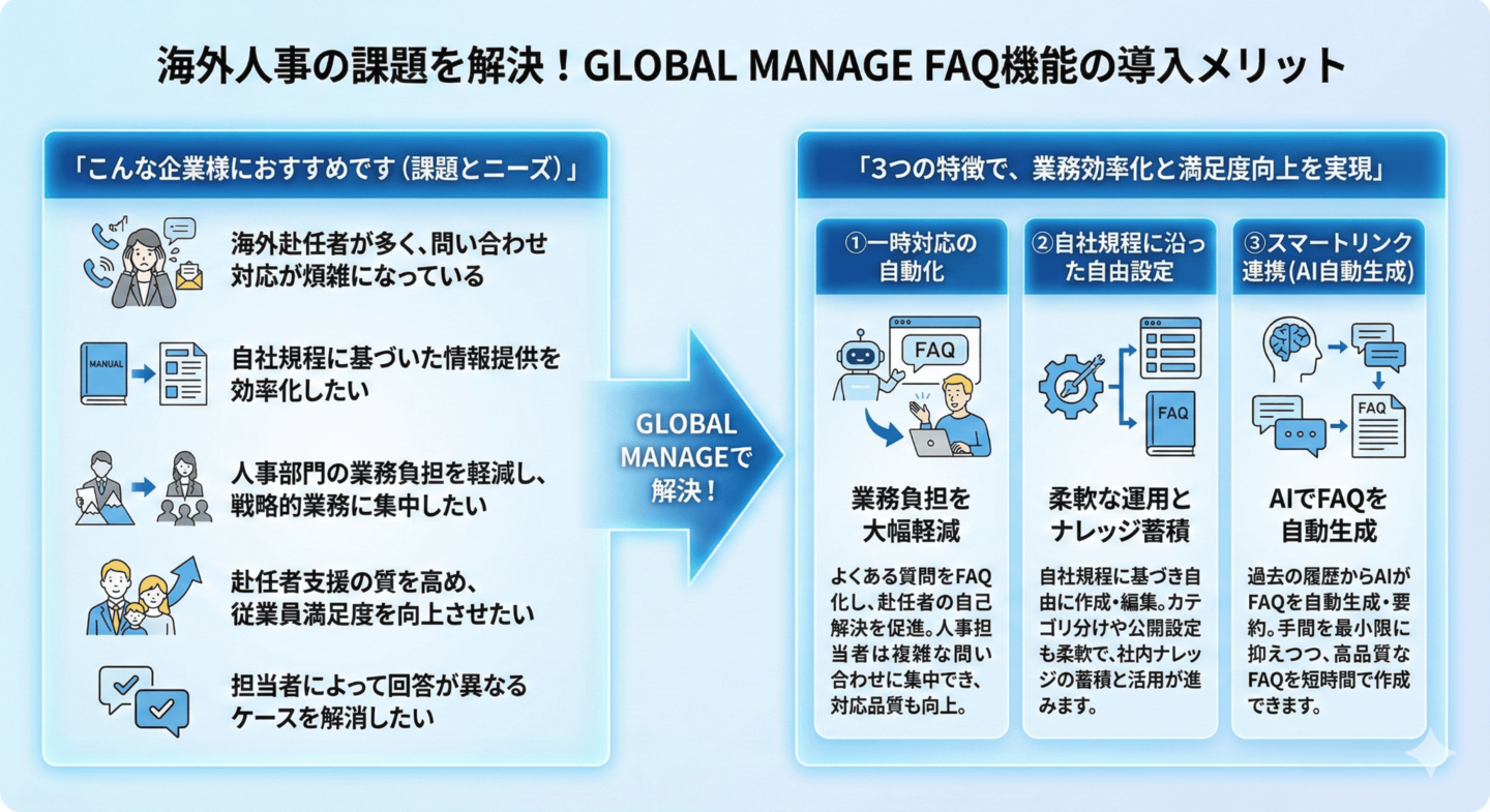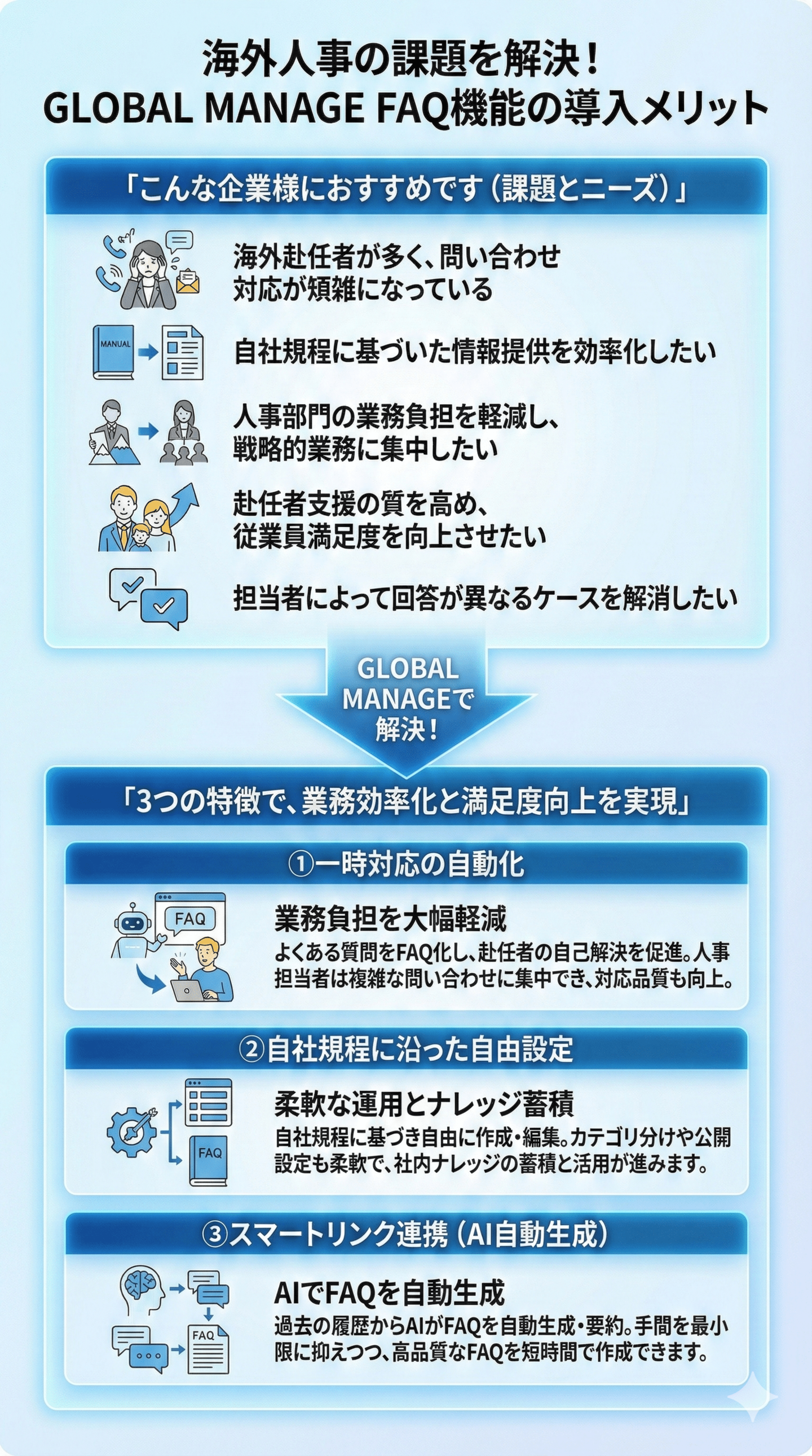そこで、「GLOBAL MANAGE」では、FAQ管理機能を新たに強化。人事業務の効率化と、赴任者支援の質的向上を両立する革新的な仕組みです。