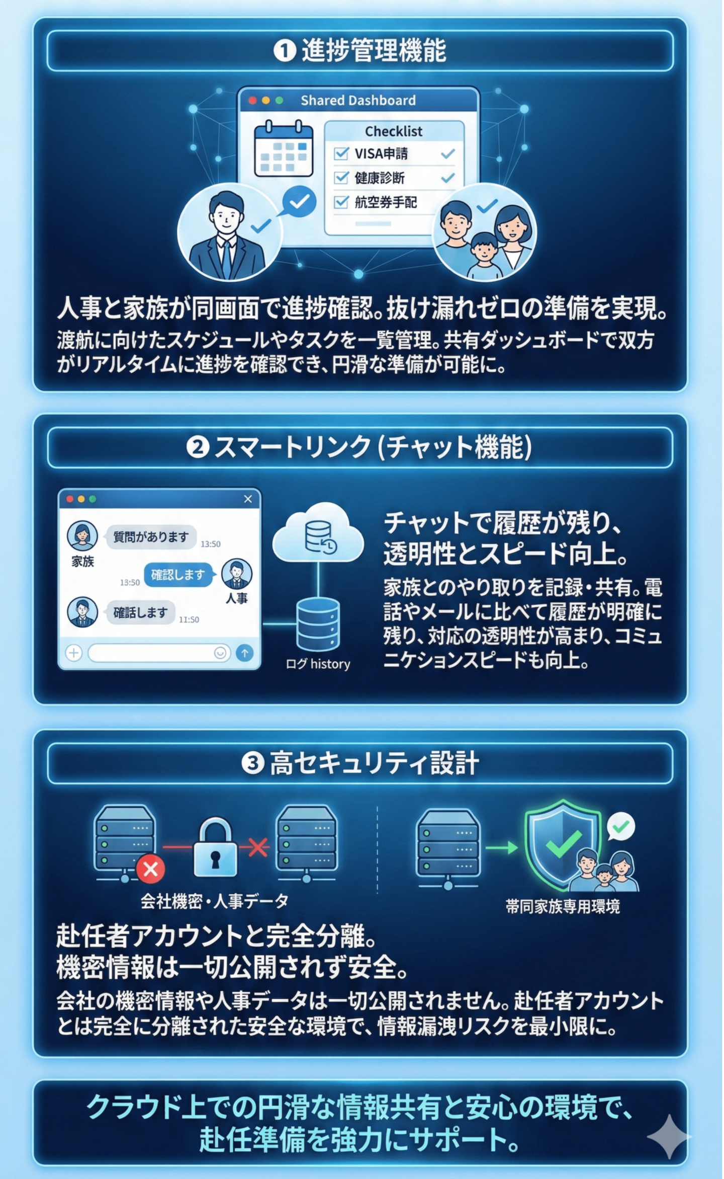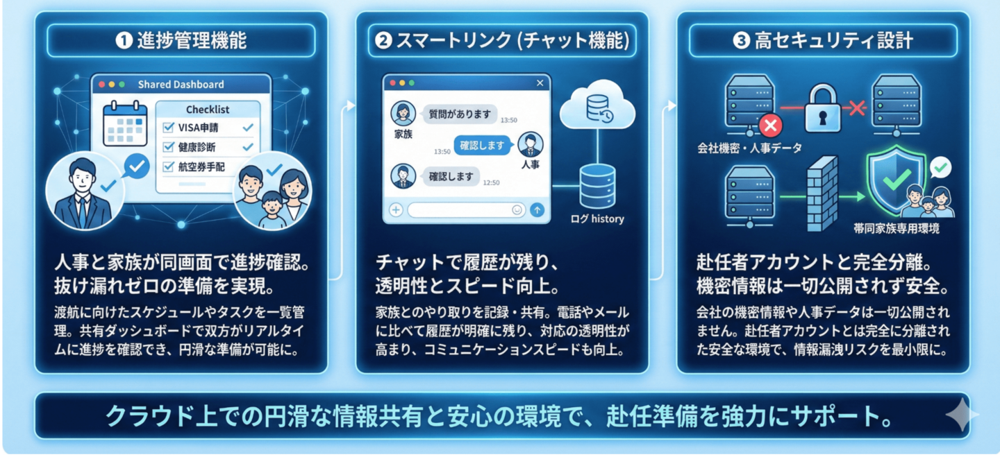 帯同家族専用アカウントでは、以下の機能を開放し、人事担当者と家族がクラウド上で円滑に情報共有・準備を進められる体制を構築しています。