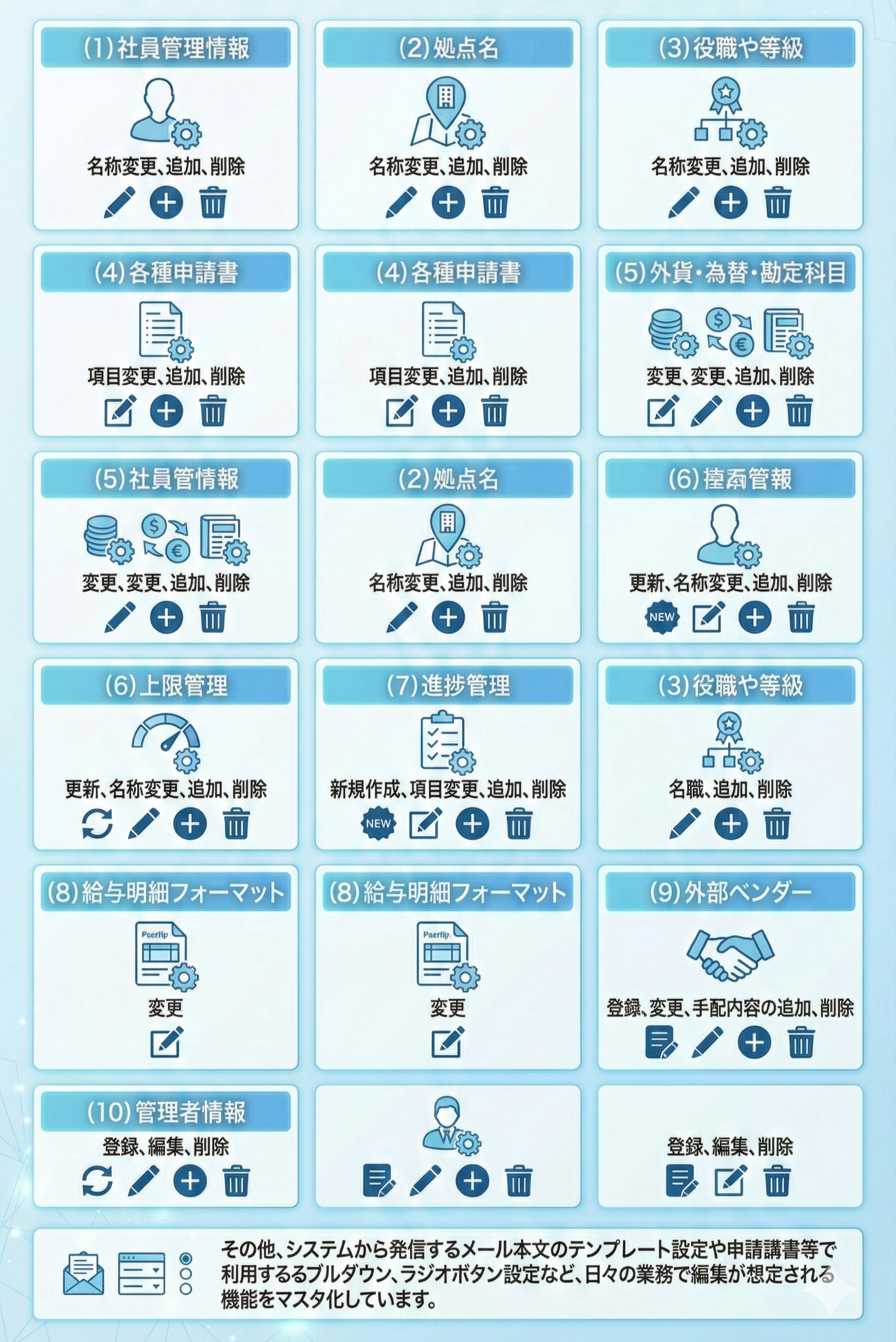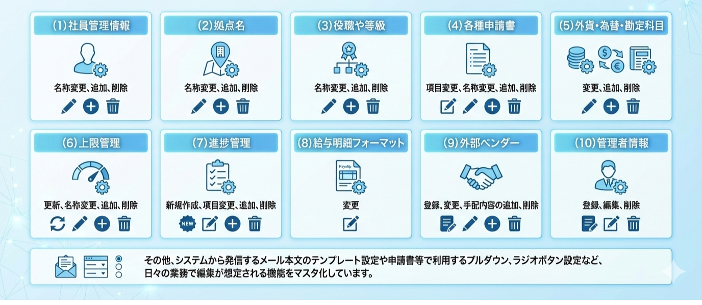 GLOBAL MANAGEでは、下記のメニューにマスタ機能を設けているため、導入後の組織変更や規程改定など、あらゆる状況にも自社で簡単に対応できます。