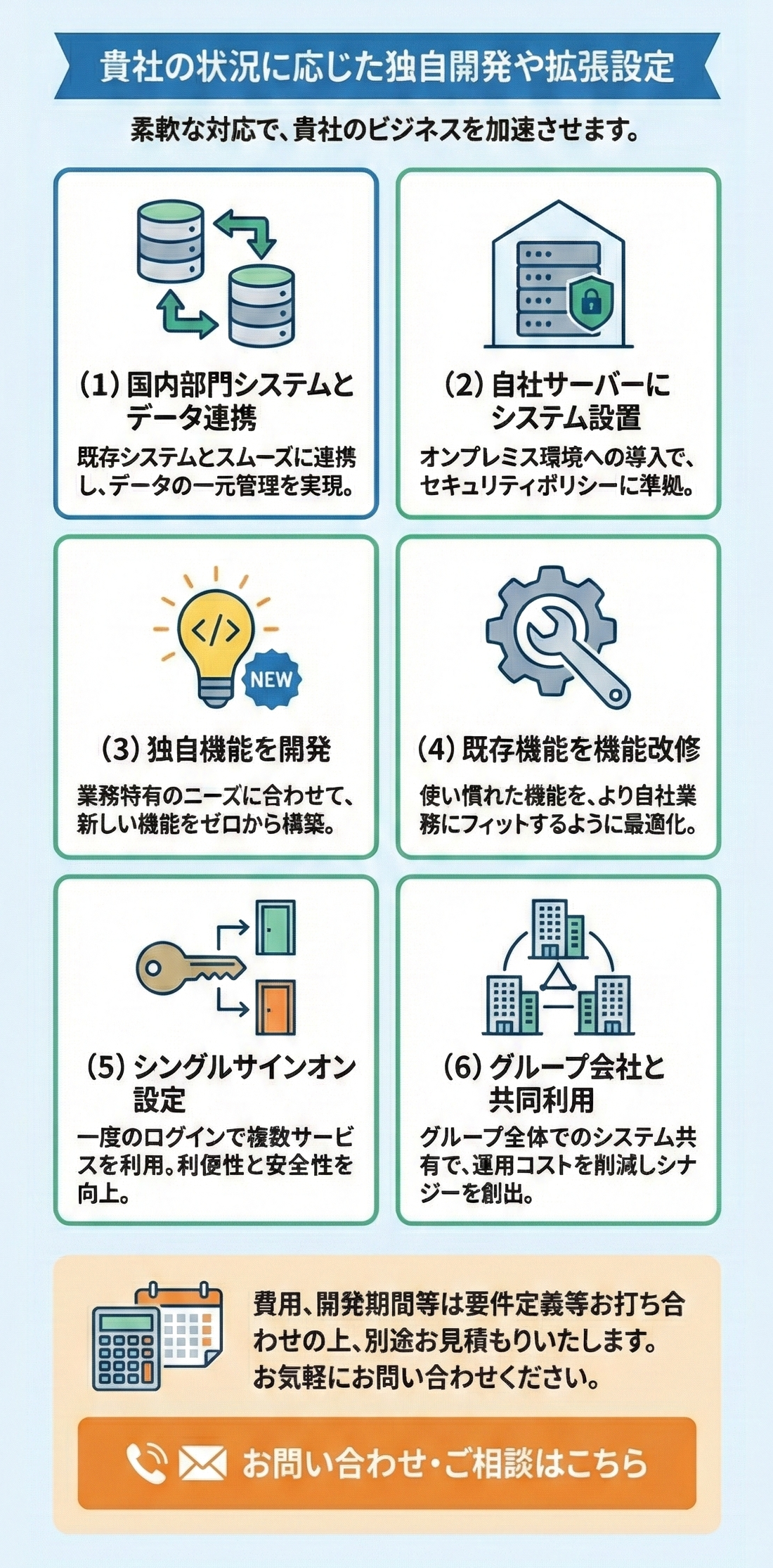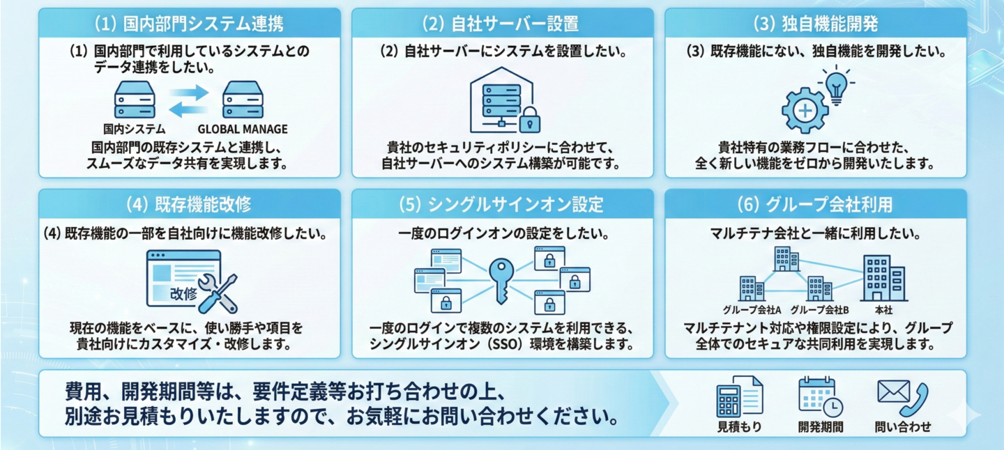 また、貴社独自の機能開発をはじめ、指定サーバーへの設置、自社システムとのAPI連携、シングルサインオンの設定なども対応いたします。