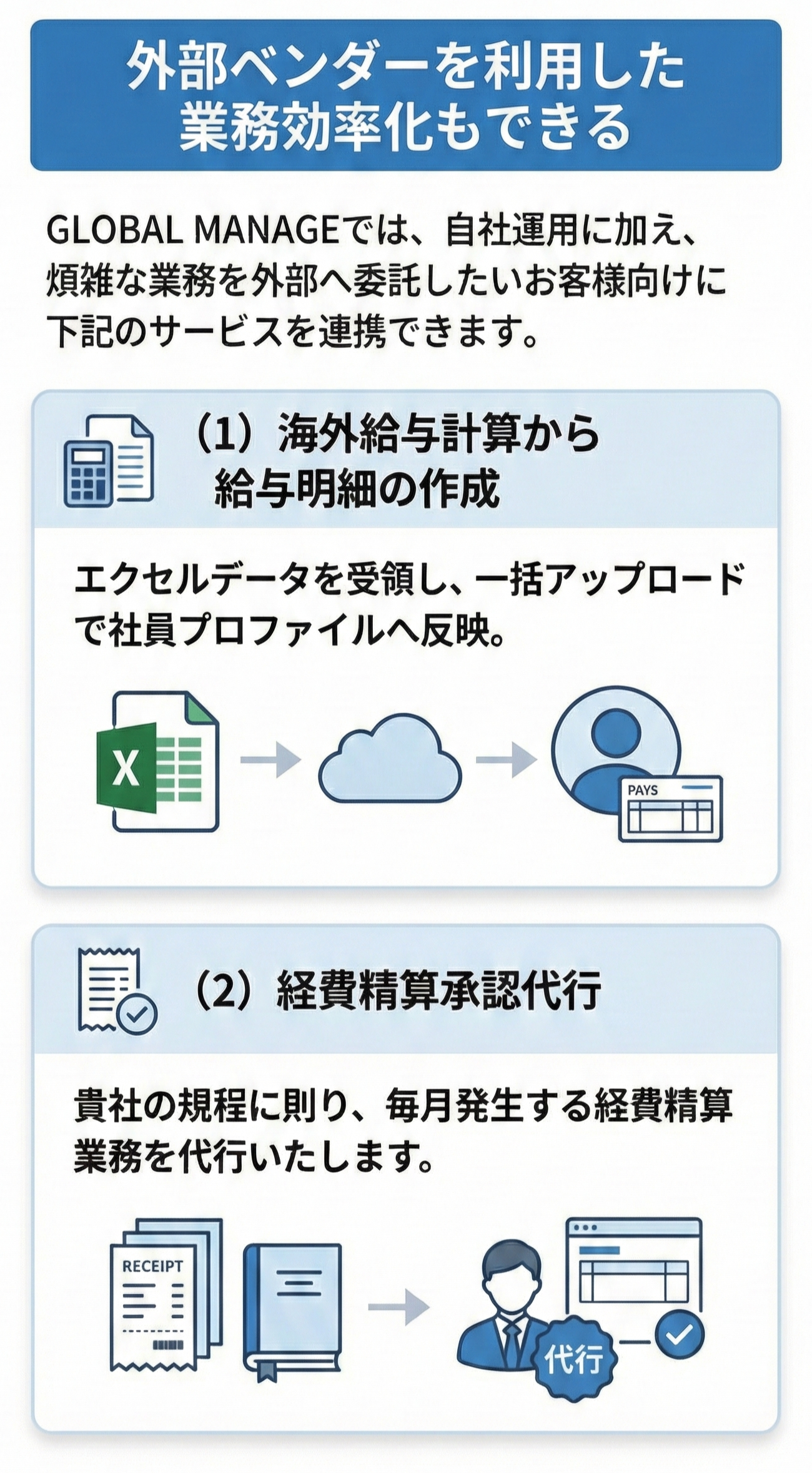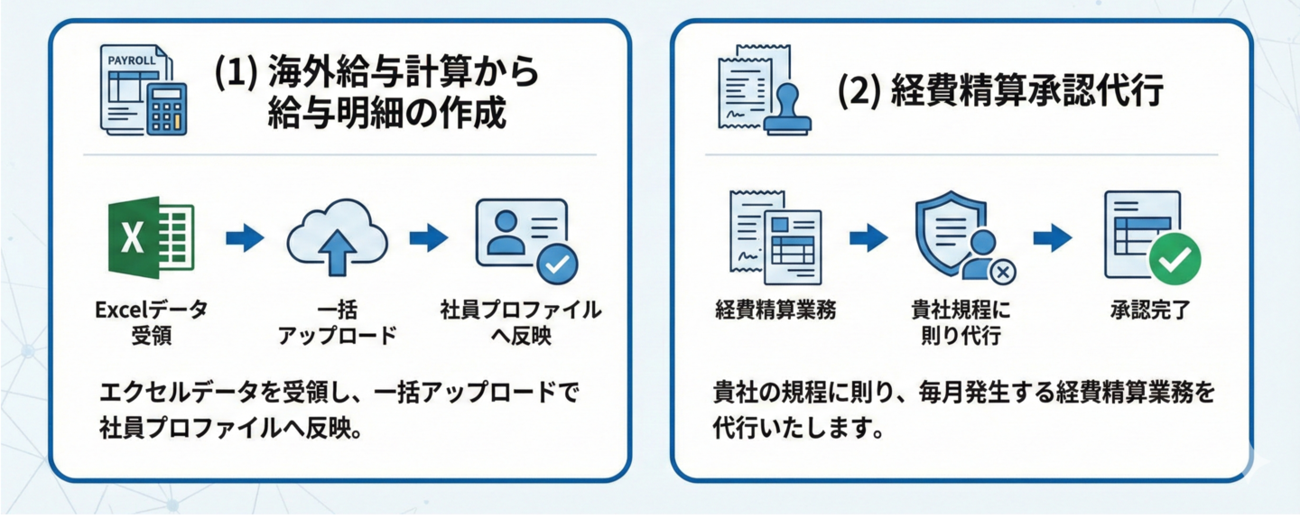 GLOBAL MANAGEでは、自社で運用できる給与明細配信機能をはじめ、経費精算機能を用意していますが、このような煩雑な業務を外部へ委託したいというお客様向けに下記のサービスを連携できます。