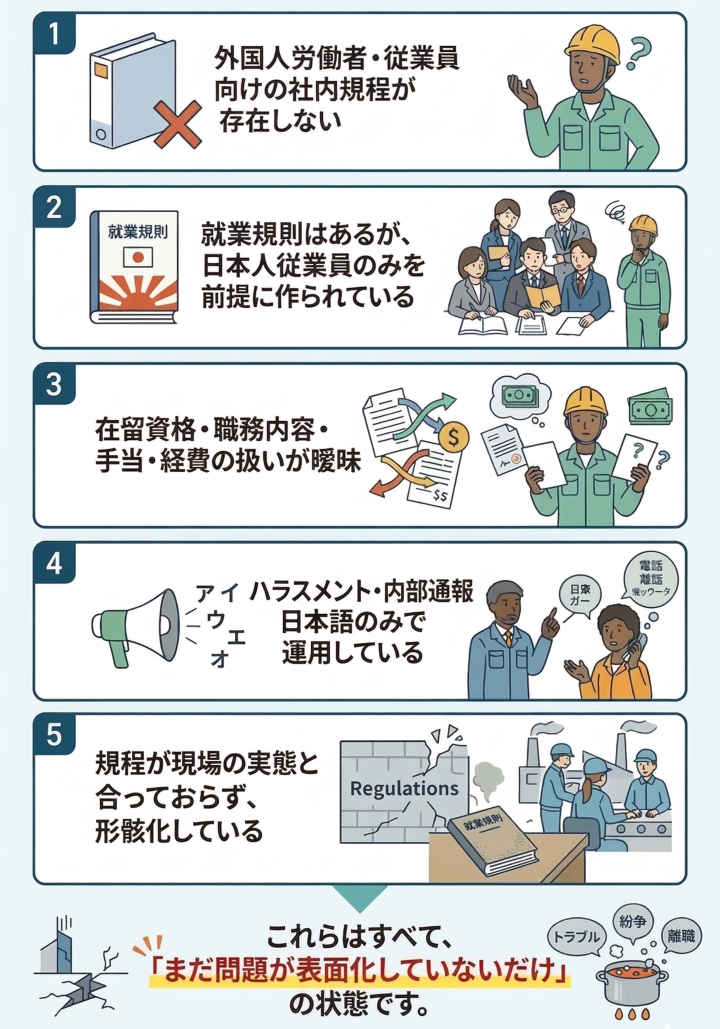 在留資格と職務内容の不整合、労働条件の認識違い、ハラスメントや内部通報の言語対応不足など、ルールが曖昧な状態はトラブルや信用低下につながります。