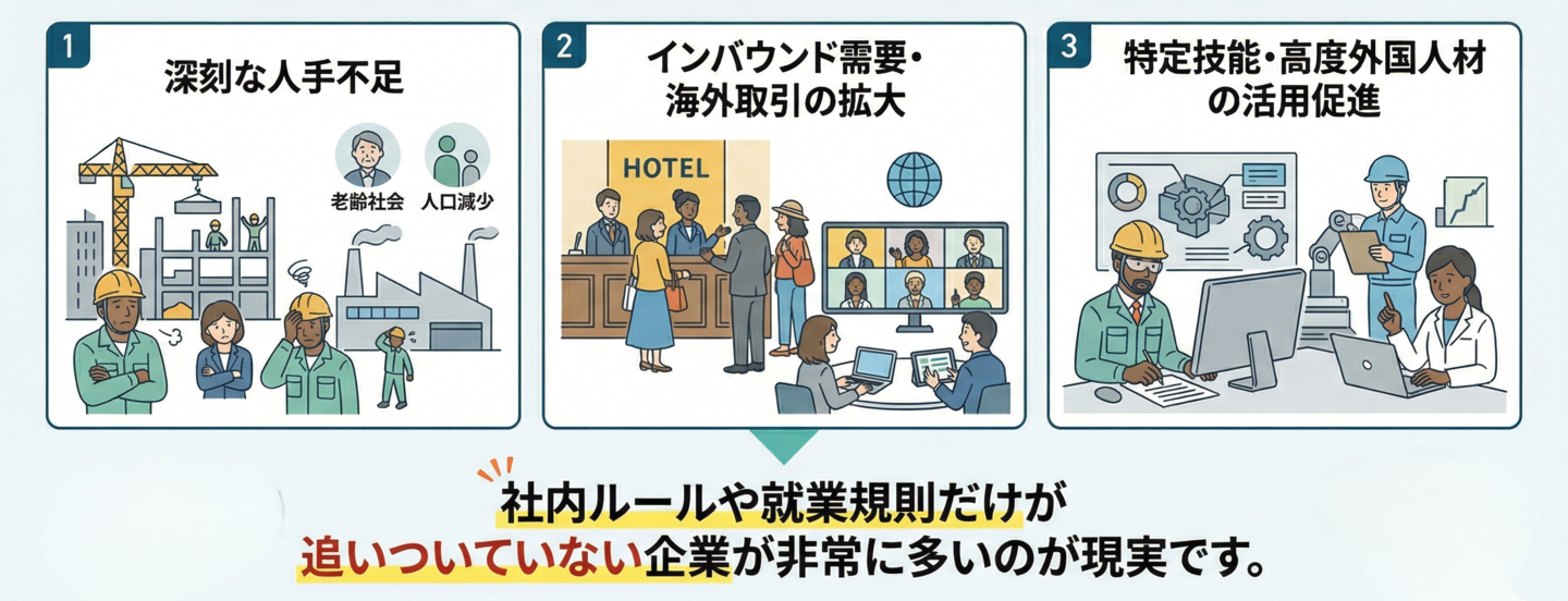 外国人労働者・多国籍人材の受け入れが進む一方で、社内規程が未整備、または日本人従業員を前提としたまま運用されている企業は少なくありません。
