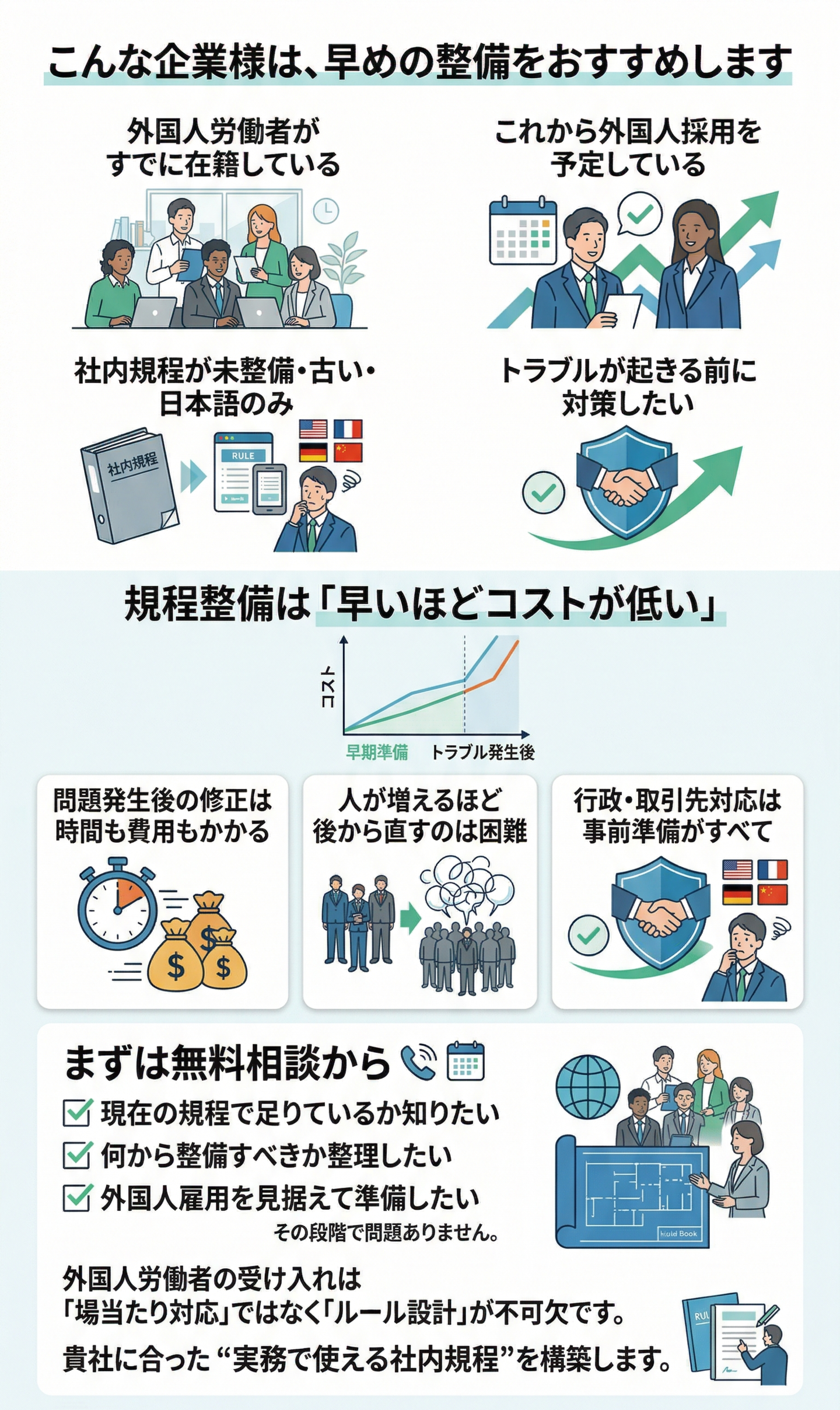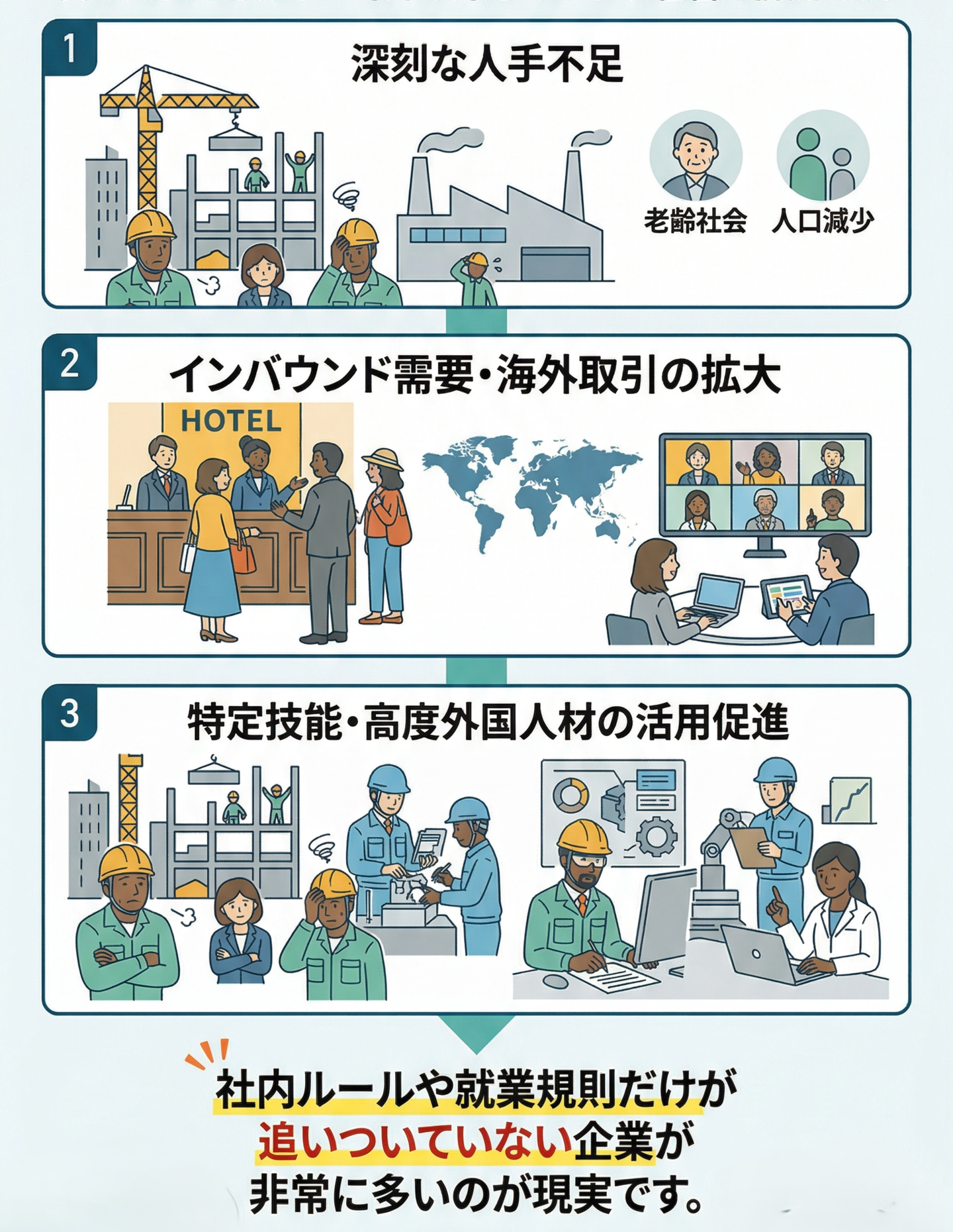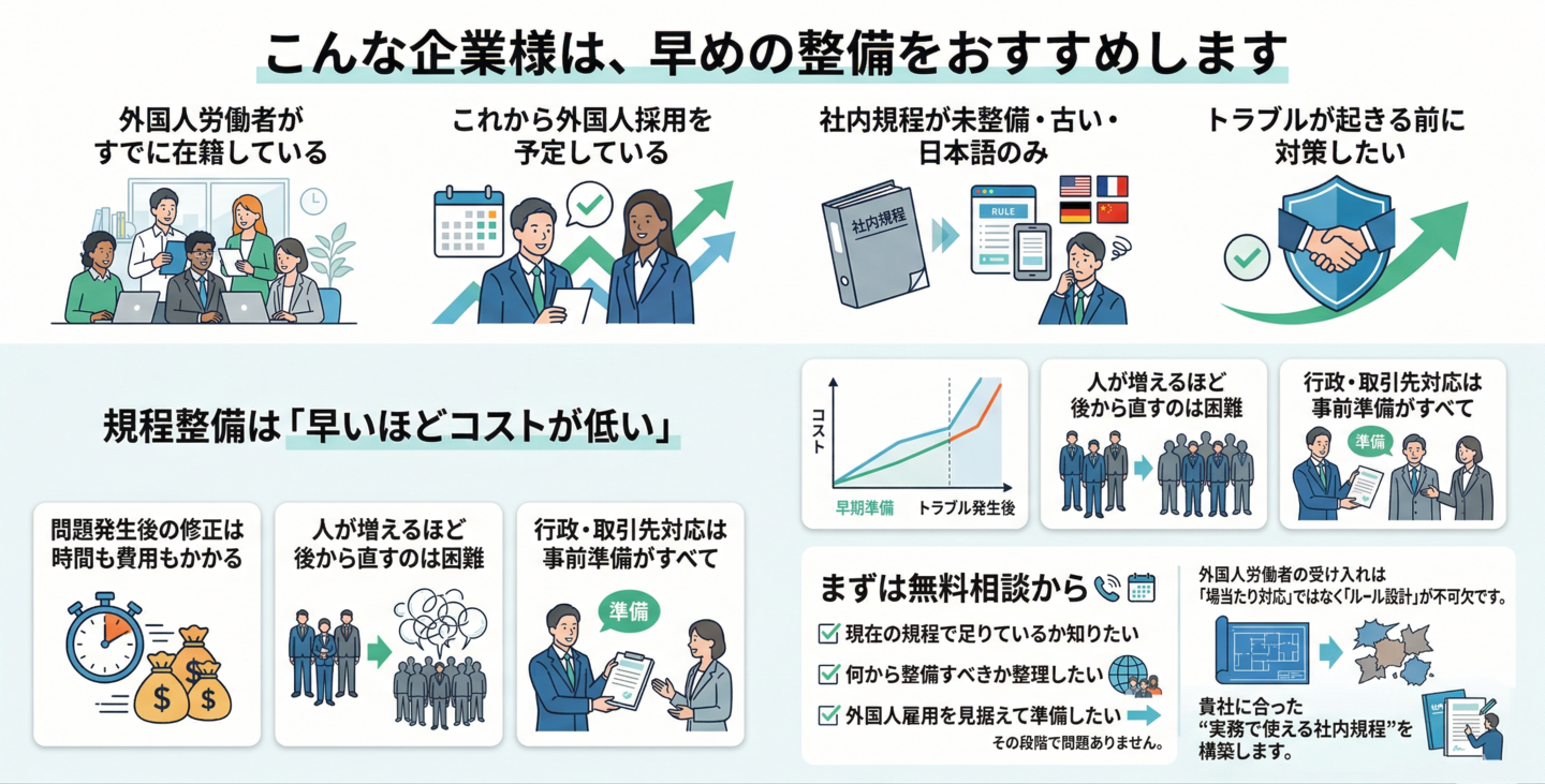 トラブルや行政指導が起きる前に、外国人雇用を前提とした社内ルール整備が求められています。