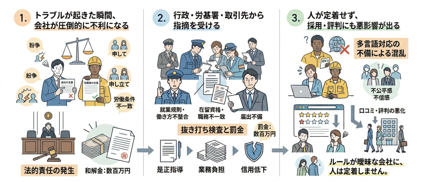 また、就業規則と実態の不整合や在留資格との不一致は、行政や労基署、取引先からの指摘につながります。