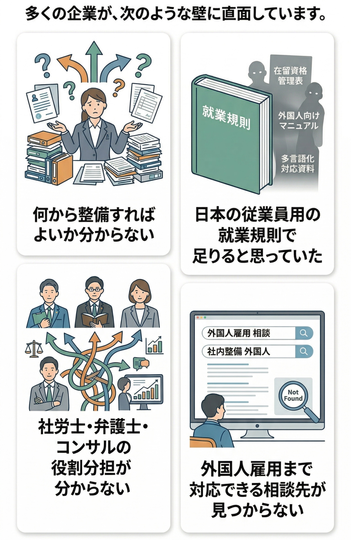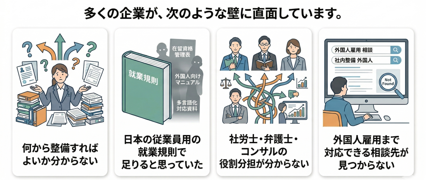 また、社労士・弁護士・コンサルの役割分担が不明確で、外国人雇用まで含めて相談できる先が見つからないという声も少なくありません。