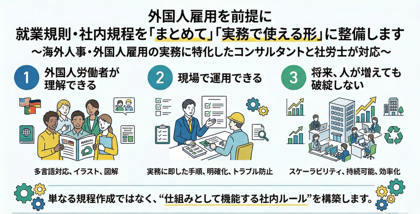 海外人事・外国人雇用の実務に特化したコンサルティング会社として、外国人雇用を前提にした就業規則・社内規程の整備を支援しています。