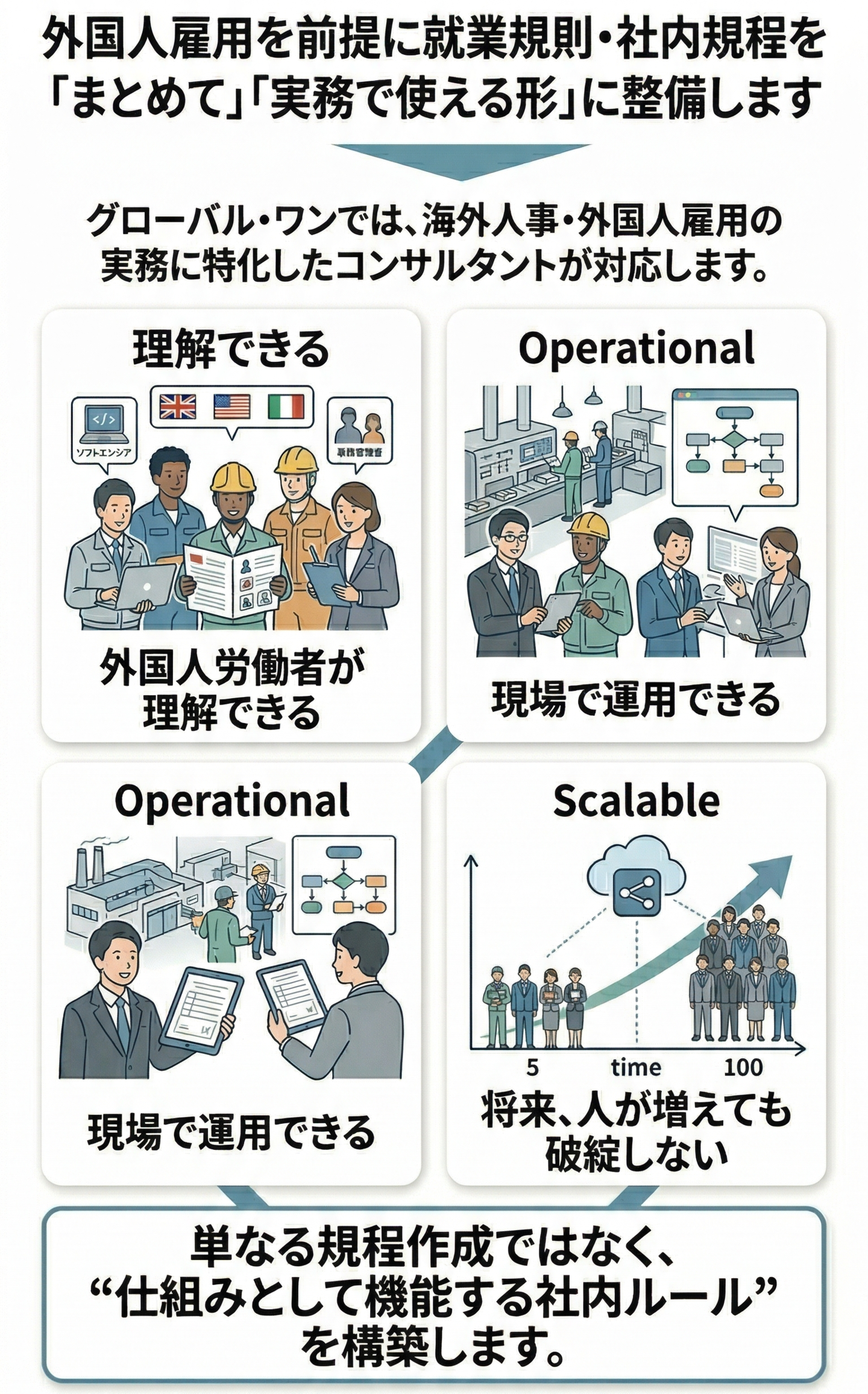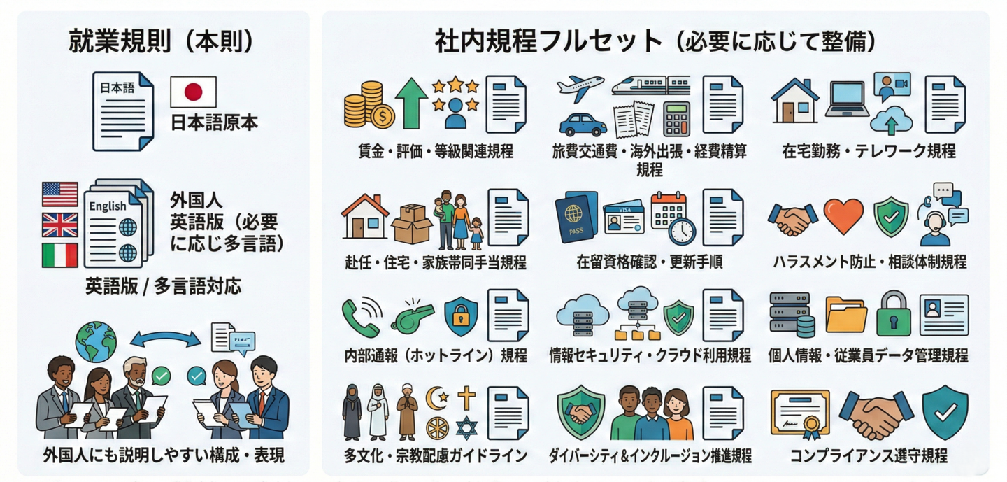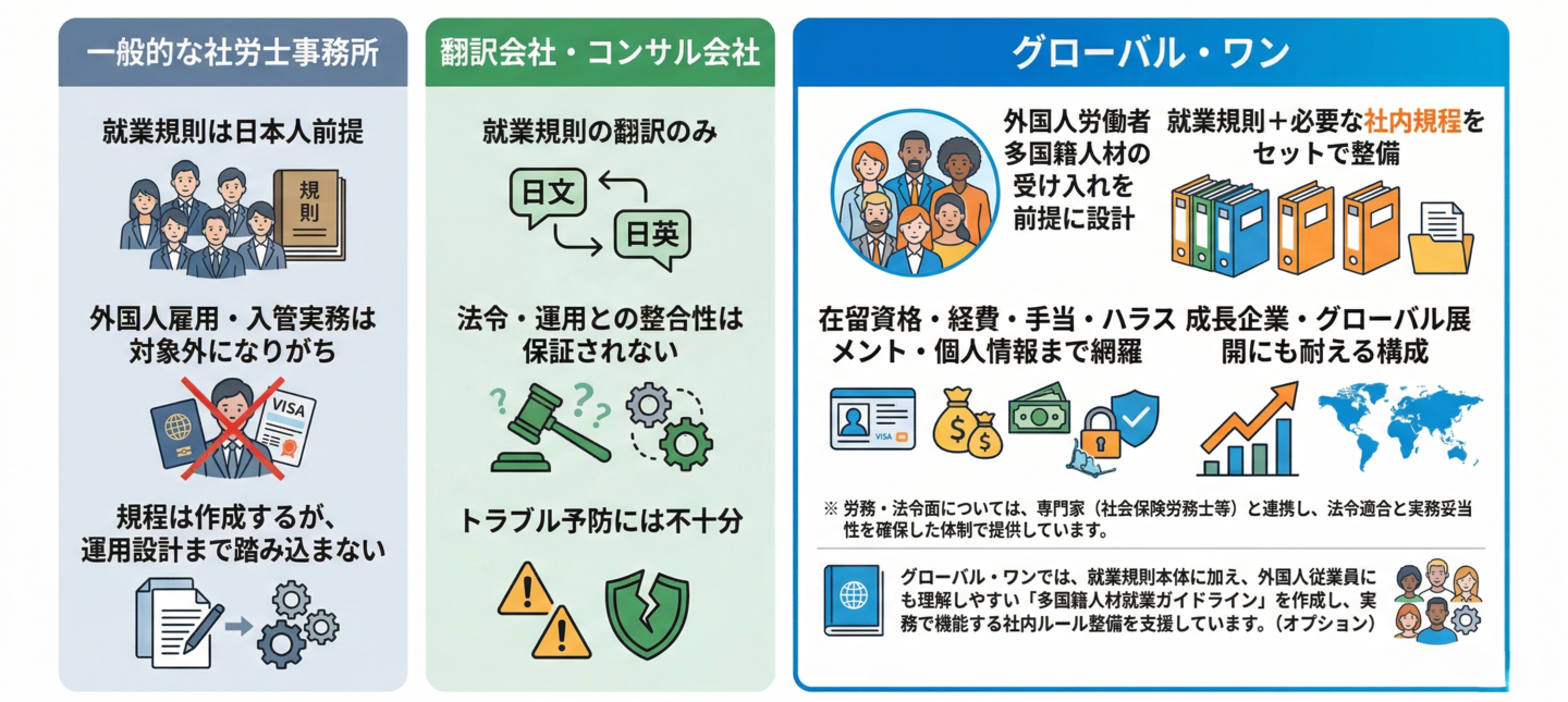 グローバル・ワンでは、就業規則本則から社内規程まで、外国人従業員・多国籍人材の雇用を前提に一貫して整備します。