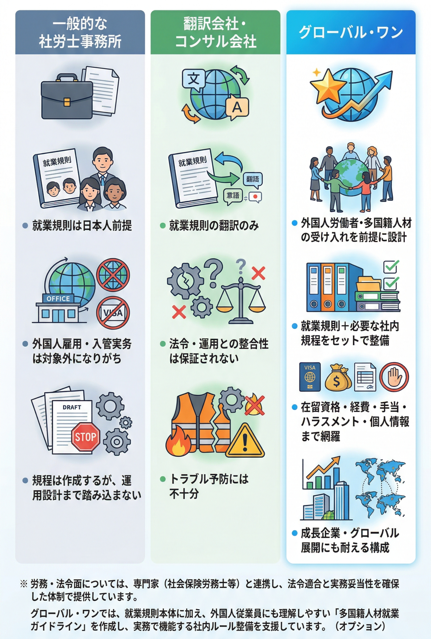 一般的な社労士事務所や翻訳会社では、日本人前提の就業規則や翻訳対応に留まり、外国人雇用特有の在留資格・手当・経費・ハラスメント・個人情報対応まで踏み込めないケースが少なくありません。